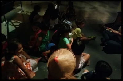 They got to try on a hat that rickshaw pullers used to shelter themselves from the sun and the rain.